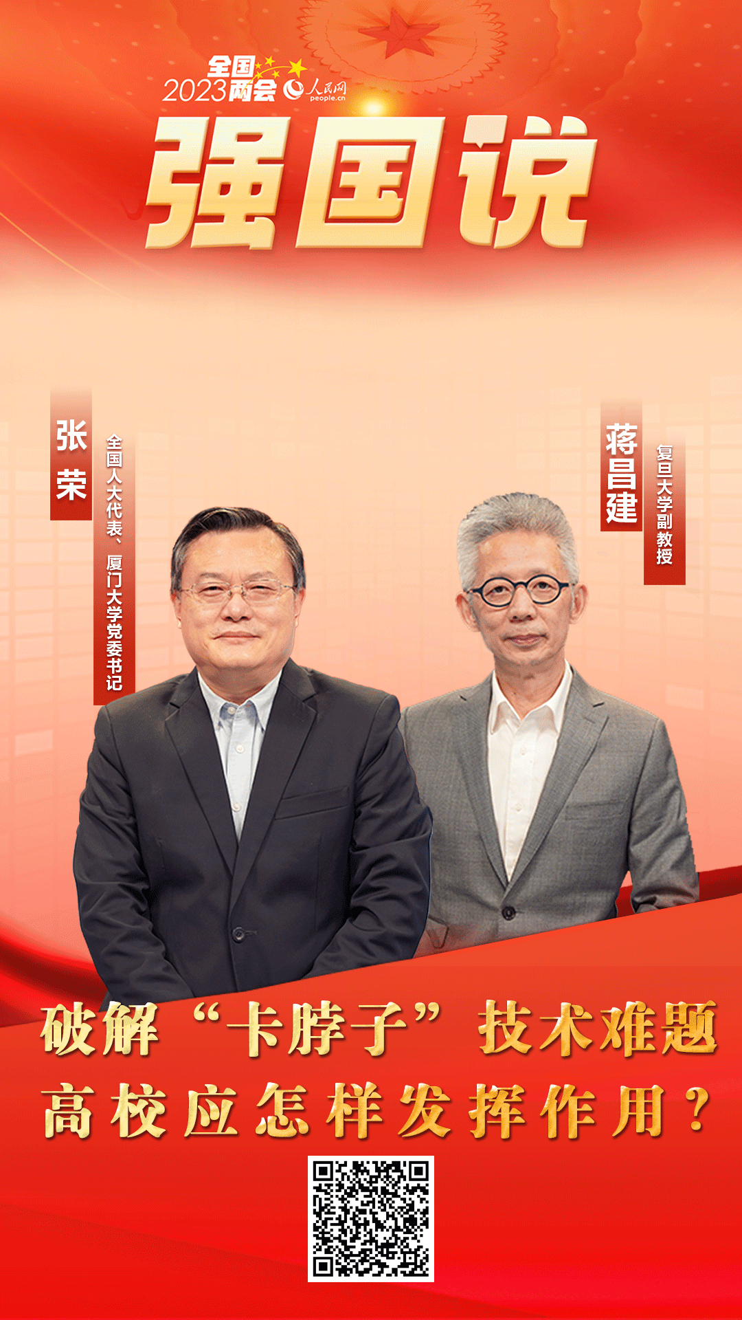 教育、科技、人才是全面建設社會主義現代化國家的基礎性、戰略性支撐。2023年全國兩會期間,人民網《強國說》欄目邀請全國人大代表、廈門大學黨委書記張榮與復旦大學副教授蔣昌建,就相關話題展開探討交流。